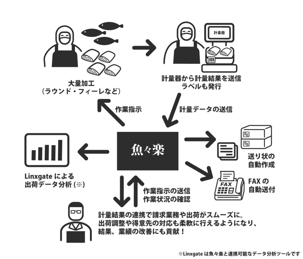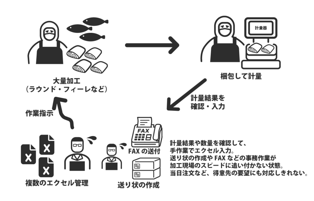 日々大量の加工を行うため、スピードが事業の成長に直結していた。計量器と連携できるシステムとして魚々楽を紹介され、業務負担を軽減し、より加工に専念できる環境を手に!